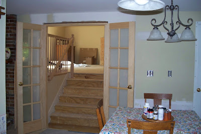Finally we are getting along with the family room addition and since I have had a number of questions about it by e-mail I thought I would answer them here. The room is 22 x 26 and has a cathedral ceiling which I am not sure how high it is but it is not super tall. There is a two car garage underneath. The french doors got installed this week so this is how we enter the room from our kitchen and living room. The carpenters are almost done and then we are doing the rest of the finish work to save money starting with a bamboo floor. We already had a painting marathon so it's nice to have that out of the way.
